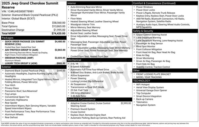 South Fork Chrysler Jeep Dodge Ram is very proud to offer this beautiful 2025 Jeep Grand Cherokee in Diamond Black Crystal Pearlcoat. This vehicle has passed our comprehensive inspection and comes with the following features: 2025 Grand Cherokee Summit 4WD, 19 Speakers High Performance Audio, 2nd-Row Manual Window Shades, 950 Watt Amplifier, Active Noise Control System, ADV Protech Group IV, Auxiliary Battery, Deluxe Headliner, Front Passenger Interactive Display, Garage door transmitter, Genuine wood dashboard insert, Genuine wood door panel insert, Gloss Black Exterior Accents, Hands-Free Active Driving Assist System, Heads-Up Display, Heated steering wheel, Luxury Tech Group V, Navigation System, Neutral Gray Exterior Accents, Painted Door Cladding, Palermo Leather Door Trim, Palermo Leather Seats, Quick Order Package 23U Summit Reserve, Rearview Autodim Digital Display Mirror, Summit, Summit Badge, Ventilated Rear Seats, Wheels: 21" x 9" Black Painted Aluminum, Wheels: 21" x 9" Machined Face/Painted Aluminum, Windshield Wiper De-Icer, Wireless Charging Pad. 19/26 City/Highway MPG
