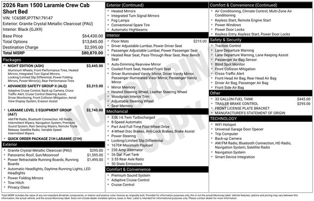 Standout features include the Night Edition package, which adds a bold, blacked-out aesthetic with details like black headlamp bezels, 22-inch forged aluminum wheels, and a sport performance hood. The Advanced Safety Group II and Laramie Level 2 Equipment Group further enhance your driving confidence with advanced driver-assist technologies, a 14.4-inch touchscreen display, and a premium harman/kardon sound system.