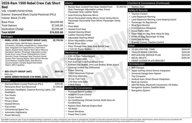 Whether you're tackling the great outdoors, hauling heavy loads, or simply enjoying the daily commute, the 2026 Ram 1500 Rebel is the ultimate companion. Experience the perfect blend of power, capability, and premium features that will elevate your driving experience. Visit our showroom today and let us demonstrate why this exceptional truck should be your next automotive partner. Art is for illustration purposes only. Not responsible for errors or omissions. All vehicle's are plus tax, title, license, official fees, equipment and destination fees.. Price includes: $3500 - 2026 National Retail Consumer Cash . Exp. 02/02/2026