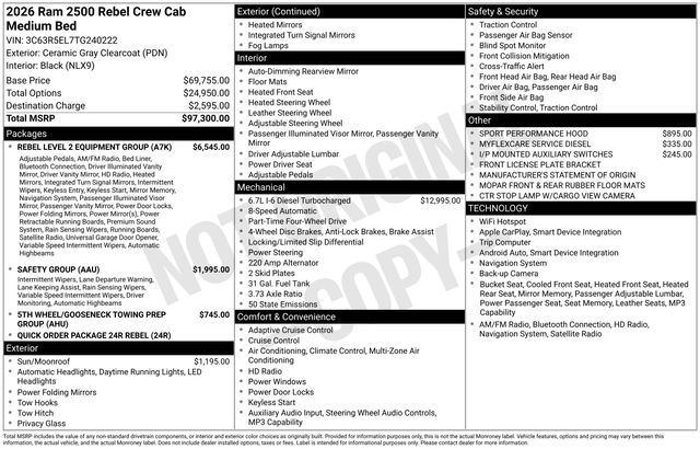 South Fork Chrysler Jeep Dodge Ram is proud to offer this wonderful-looking 2026 Ram 2500 in Ceramic Gray Clearcoat. This vehicle has passed our comprehensive inspection and comes with the following features: 2026 2500 Rebel 115V Auxiliary Rear Power Outlet, 14.4" Touchscreen Display, 17 Speaker Harman/Kardon Premium Sound, 2 Way Rear Headrest Seat, 4 Way Front Headrests, 4G LTE Wi-Fi Hot Spot, Active Lane Management System, Adaptive Steering System, Alexa Built-in, Aluminum Litho Instrument Panel Bezels with Black Trim, Apple CarPlay, Apple CarPlay/Android Auto, Auto Adjust in Reverse Exterior Mirrors, Auto Dim Exterior Mirror, Auto High Beam Headlamp Control, Auto Power-Folding Mirrors, Auto-Dimming Exterior Passenger Mirror, Black Exterior Mirrors, Block heater, Body Color Door Handles, Bucket Seats, Center Stop Lamp with Cargo View Camera, Connected Travel and Traffic Services, Connectivity - US/Canada, Delay-off headlights, Disassociated Touchscreen Display, Drowsy Driver Detection, Dual Wireless Charging Pad, Emergency Vehicle Alert System (EVAS), Exterior Mirrors Courtesy Lamps, Exterior Mirrors with Heating Element, Exterior Mirrors with Memory, Exterior Mirrors with Supplemental Signals, Folding Flat Load Floor Storage, For Details, Visit DriveUconnect.com, For More Info, Call 800-643-2112, Forward and Reverse Utility Lights, Front Door Locks 2-Door Passive Entry, Front fog lights, Front Passenger Interactive Display, Front Seat Back Map Pockets, Full Length Upgraded Floor Console, Fully automatic headlights, Global Telematics Box Module, Google Android Auto, GPS Antenna Input, GPS Navigation, HD Radio, Heated Front Seats, Heated Second Row Seats, Heated Steering Wheel, High Back Seats, Integrated Voice Command with Bluetooth, Leather Trimmed Bucket Seats (NL), Leather Wrapped Grab Handle, Leather Wrapped Shift Control, LED Bed Lighting, LED Dome Lamp with on/Off Switch, LED Interior Lighting, Luxury Door Trim Panel, Media Hub with 2 Charge Only USBs, Mirror Running Lights, MOPAR Deployable Bed Step, MOPAR Front and Rear Rubber Floor Mats, MOPAR Spray in Bedliner, MyFlexCare Service Diesel, Navigation System, Off-Road Info Pages, Overhead LED Lamps, ParkView Rear Back-Up Camera, Power 2-Way Driver Lumbar Adjust, Power 2-Way Passenger Lumbar Adjust, Power Adjust 8-Way Driver Seat, Power Adjust 8-Way Front Passenger Seat, Power Adjust Mirrors, Power Adjustable Pedals with Memory, Power Deployable Running Boards, Power Heated Fold Telescopic Mirrors with Memory, Power Sunroof, Power Telescoping Mirrors, Power-Adjustable Convex Aux Mirrors, Premium Overhead Console, Quick Order Package 24R Rebel, Radio: Uconnect 5 Nav with 14.4" Display, Radio/Driver Seat/Mirrors/Pedals Memory, Rain Sensitive Windshield Wipers, Rear 60/40 Folding Seat, Rebel Level 2 Equipment Group, Safety Group, Selectable Tire Fill Alert, SiriusXM Radio Service, SiriusXM with 360L, Sport Performance Hood, Sun Visors with Illuminated Vanity Mirrors, Traffic Sign Recognition, Trailer Tow Pages, Universal Garage Door Opener, Ventilated Front Seats.