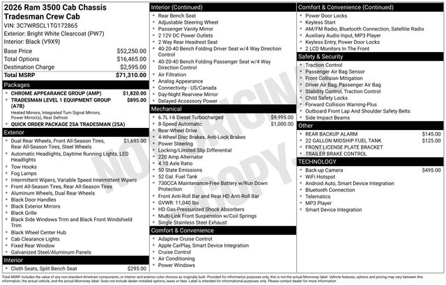 South Fork Chrysler Jeep Dodge Ram is pumped up to offer this outstanding 2026 Ram 3500 in Bright White Clearcoat. This vehicle has passed our comprehensive inspection and comes with the following features: 2026 3500 Tradesman 11.50" Dual Wheels Rear Axle, 22 Gallon Midship Fuel Tank, 6000# Front Axle with Hub Extension, Black Exterior Mirrors, Black Power Heated Fold Telescope Mirrors, Black Wheel Center Hub, Bright Front Bumper, Center Hub, Chrome Appearance Group, Chrome Grille Surround, Dual Rear Wheels, Exterior Mirrors Courtesy Lamps, Exterior Mirrors with Heating Element, Exterior Mirrors with Supplemental Signals, Manual Folding Exterior Mirrors, Matte Black Mesh Grille with Chrome, Mirror Running Lights, Nexen Brand Tires, Power Adjust Mirrors, Power-Adjustable Convex Aux Mirrors, Quick Order Package 25A Tradesman, Rear Window Defroster, Tradesman Level 1 Equipment Group, Trailer Brake Control, Trailer Light Check, Wheels: 17" x 6.0" Black Painted Steel.