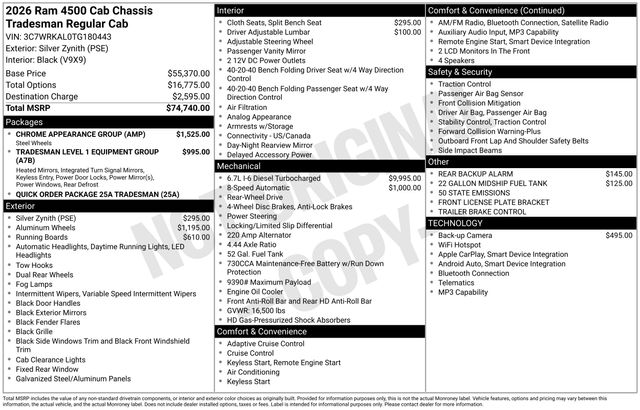 South Fork Chrysler Jeep Dodge Ram is excited to offer this good-looking 2026 Ram 4500HD in Silver Zynith. This vehicle has passed our comprehensive inspection and comes with the following features: 2026 4500HD Tradesman 19.5" x 6.0" Steel Wheels, 22 Gallon Midship Fuel Tank, Black Exterior Mirrors, Bright Front Bumper, Center Hub, Chrome Appearance Group, Chrome Grille Surround, Dual rear wheels, Exterior Mirrors Courtesy Lamps, Exterior Mirrors with Heating Element, Exterior Mirrors with Supplemental Signals, Front 1-Touch Down Power Windows, Manual Folding Exterior Mirrors, Manuarl Telescoping Mirrors, Matte Black Mesh Grille with Chrome, Mirror Power Heat Fold Telescope Black, Mirror Running Lights, Power Adjust Mirrors, Power-Adjustable Convex Aux Mirrors, Quick Order Package 25A Tradesman, Rear Window Defroster, Remote Keyless Entry, Speed Sensitive Power Locks, Tradesman Level 1 Equipment Group, Trailer Brake Control, Trailer Light Check, Upgraded Door Trim Panel.