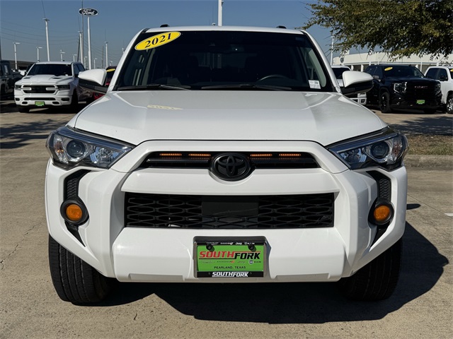 South Fork Chrysler Jeep Dodge Ram is pumped up to offer this hardy, reliable 2021 Toyota 4Runner in White. This vehicle has passed our comprehensive inspection and comes with the following features: Clean CARFAX. 4Runner SR5, RWD, White, Black/Graphite Cloth, 17" x 7.0" 6-Spoke Alloy Wheels, 4-Wheel Disc Brakes, 8 Speakers, ABS brakes, Air Conditioning, Alloy wheels, AM/FM radio: SiriusXM, Apple CarPlay/Android Auto, Auto High-beam Headlights, Brake assist, Driver door bin, Driver vanity mirror, Emergency communication system: Safety Connect with 1-year trial, Exterior Parking Camera Rear, Front Bucket Seats, Front fog lights, Heated door mirrors, Illuminated entry, Leather Shift Knob, Leather steering wheel, Low Fabric Seat Trim, Occupant sensing airbag, Power door mirrors, Power windows, Radio: Audio, Rear window defroster, Remote keyless entry, Security system, Speed control, Speed-sensing steering, Split folding rear seat, Spoiler, Steering wheel mounted audio controls, Telescoping steering wheel, Tilt steering wheel, Variably intermittent wipers.