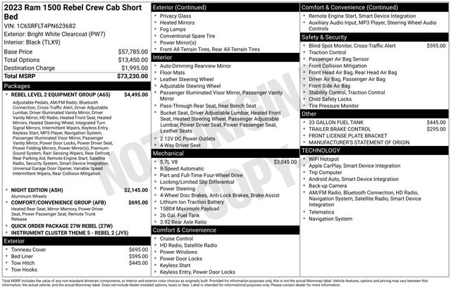 South Fork Chrysler Jeep Dodge Ram is pumped up to offer this wonderful 2023 Ram 1500 in Bright White Clearcoat. This vehicle has passed our comprehensive inspection and comes with the following features: Clean CARFAX. *4WD, Bluetooth, Hands-Free connection, Navigation!, Backup Camera, Cruise Control, Keyless Entry, Power Locks, Power Windows, Towing Package, Apple Carplay, Android Auto, 115V Auxiliary Rear Power Outlet, 12" Touchscreen Display, 2-Door Passive Entry, Front Door Locks, 2nd Row In Floor Storage Bins, 4 Way Front Headrests, 4-Wheel Disc Brakes, 4G LTE Wi-Fi Hot Spot, 6 Speakers, ABS brakes, Accent Color Door Handles, Apple CarPlay, Auto-Dimming Exterior Driver Mirror, Black Exterior Mirrors, Black Front Bumper w/Black Plate, Black Premium Power Mirrors, Blind Spot & Cross Path Detection, Brake assist, Bucket Seats, Comfort/Convenience Group, Connected Travel & Traffic Services, Connectivity - US/Canada, Convex Wide-Angle Exterior Mirror Insert, Disassociated Touchscreen Display, Exterior Mirrors Courtesy Lamps, Exterior Mirrors w/Heating Element, Exterior Mirrors w/Memory, Exterior Mirrors w/Supplemental Signals, Foam Bottle Insert (Door Trim Panel), For Details, Visit DriveUconnect.com, For More Info, Call 800-643-2112, Global Telematics Box Module (TBM), Google Android Auto, GPS Antenna Input, GPS Navigation, Grille Surround 2 Black Texture 3 Black, harman/kardon 19 Speaker Premium Sound, HD Radio, Heated Front Seats, Heated Second Row Seats, Heated Steering Wheel, Integrated Center Stack Radio, Integrated Voice Command w/Bluetooth, Media Hub w/2 Charge Only USBs, Navigation System, Night Edition, Off-Road Information Pages, ParkSense Front/Rear Park Assist w/Stop, Power 2-Way Driver Lumbar Adjust, Power 8-Way Driver & Passenger Seats, Power 8-Way Driver Seat, Power Adjustable Pedals, Power-Folding Mirrors, Quick Order Package 27W Rebel, Radio: Uconnect 5 Nav w/12.0" Display, Rain Sensitive Windshield Wipers, RAM Grille Badge - Black, Rear Dome w/On/Off Switch Lamp, Rear Power Sliding Window, Rear Underseat Compartment Storage, Rear Window Defroster, Rebel Level 2 Equipment Group, Remote Start System, Remote Tailgate Release, Security Alarm, SiriusXM Radio Service, SiriusXM w/360L, Speed control, Sun Visors w/Illuminated Vanity Mirrors, Universal Garage Door Opener, USB Host Flip, Wheels: 18" x 8.0" Gloss Black, Wireless Charging Pad.